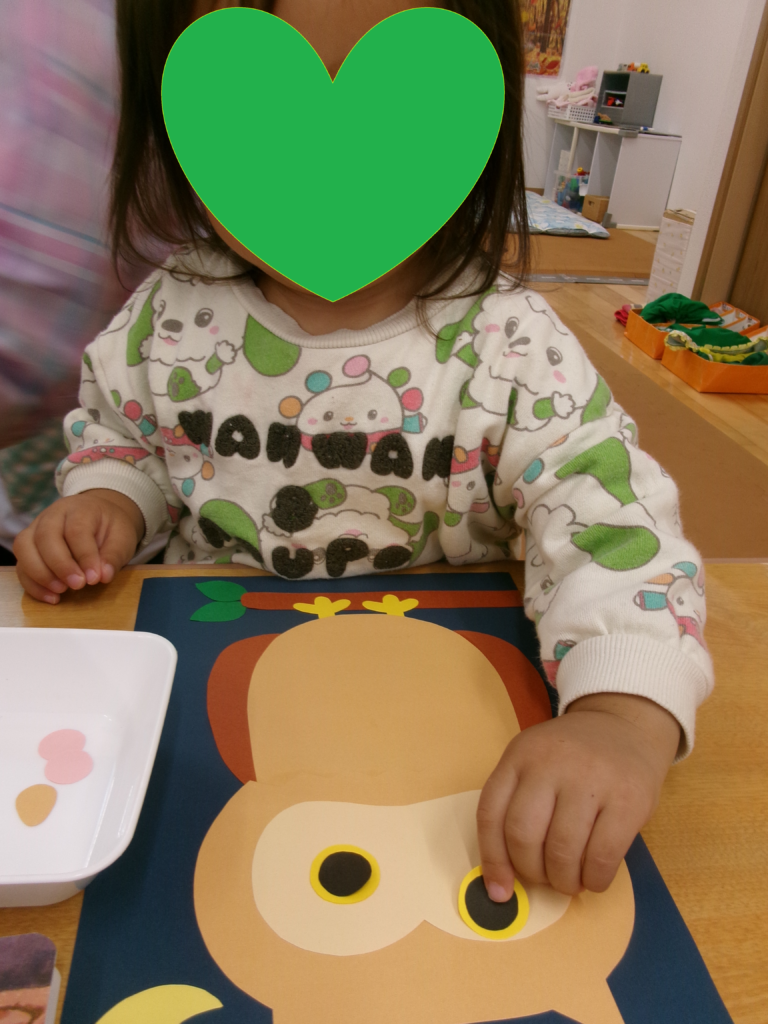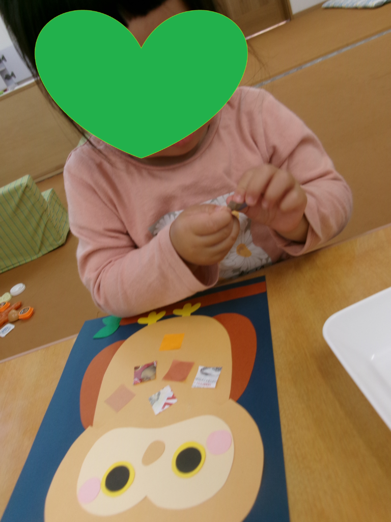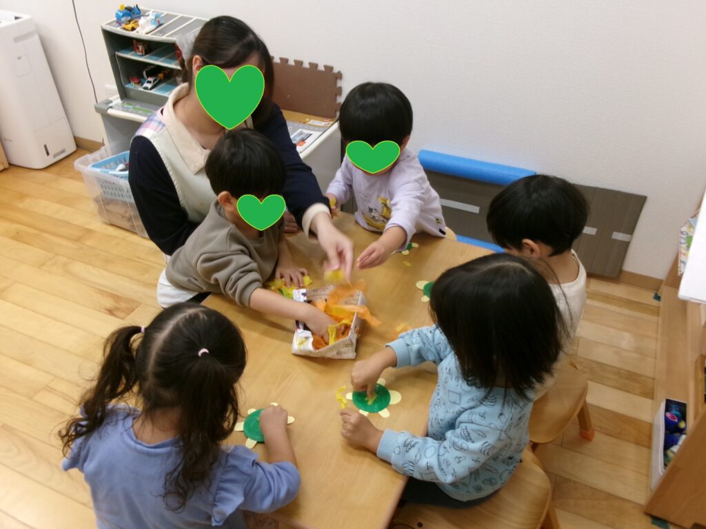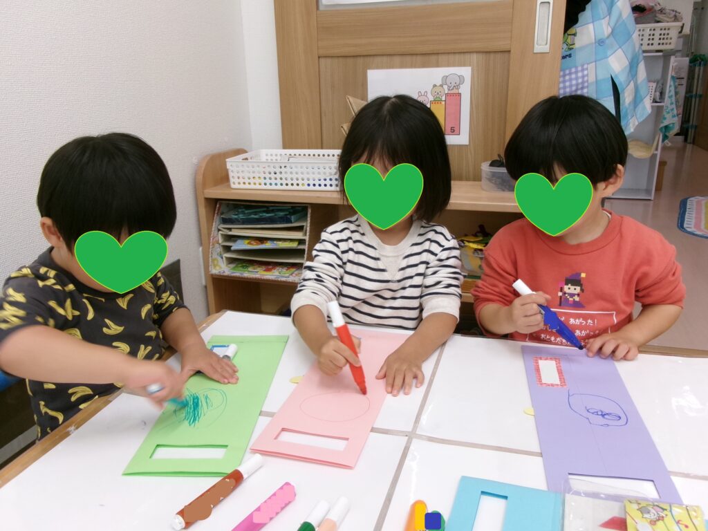 ジャック・オー・ランタンと黒猫の顔のパーツをのり付けして、顔を作りました。それぞれ表情が違って可愛らしい出来栄です!ハロウィンパーティーでお菓子をもらえるかな?子ども達は楽しみにしています。