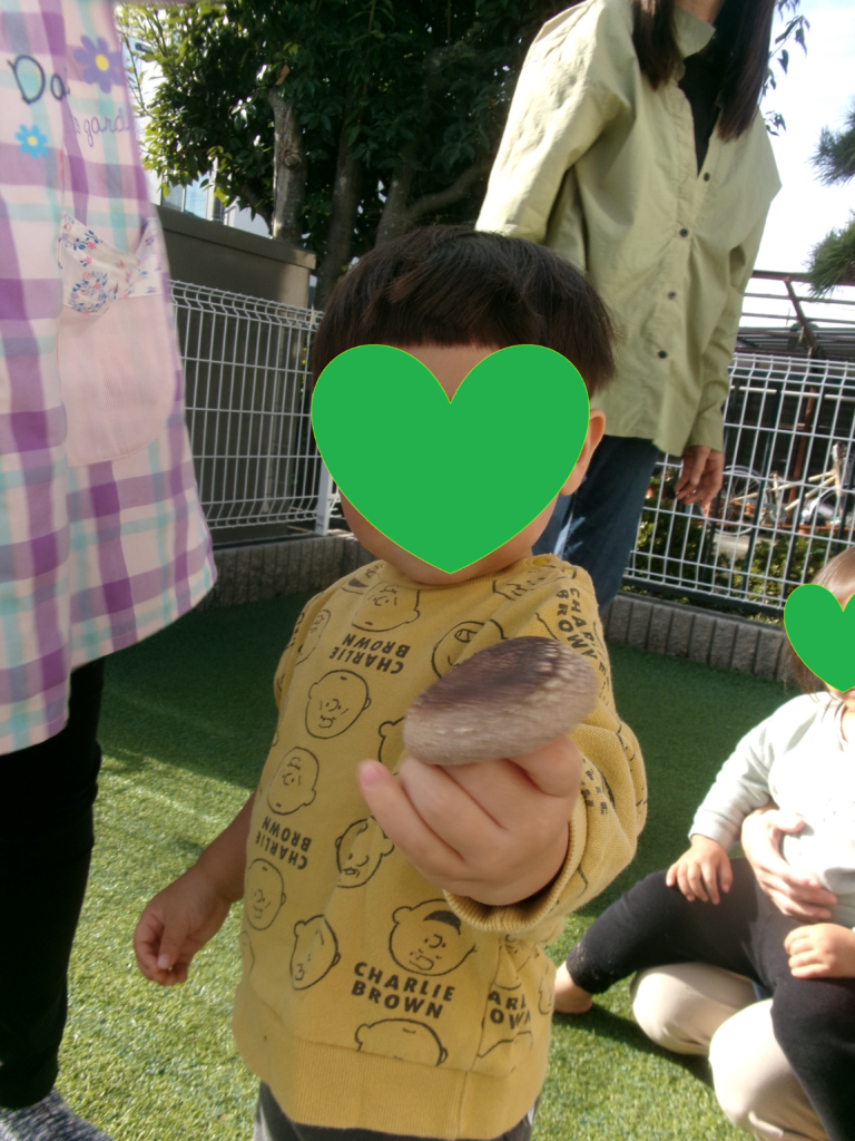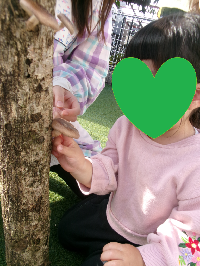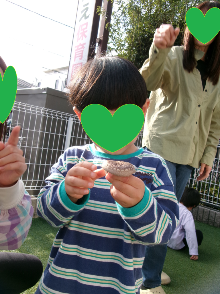 シイタケを収穫しました! ぷりぷり肉厚のおいしそうなシイタケ。子ども達は、木からシイタケを採るとき真剣な表情になっていましたが、採れるとにっこり笑顔で保育士に見せてくれました。とても良い経験ができました!