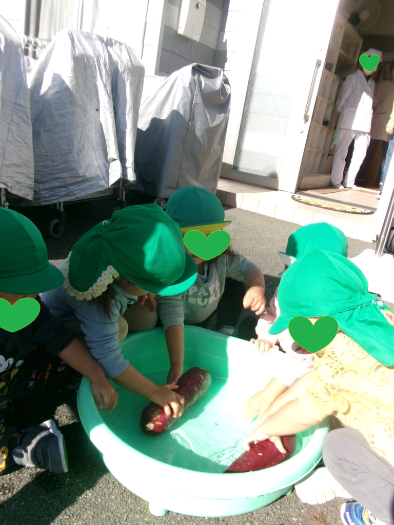 育ててきたさつまいもを「うんとこしょっ どっこいしょっ」とみんなで力を合わせて抜きました。さつまい以外にもコガネムシの幼虫が土を掘る度にもぞもぞと出てきて、ビックリ。2歳児のお友だちが幼虫を捕まえて、飼育ケースの中が幼虫で一杯。おいもを抜いた後は、周りに落ちている葉っぱや根っこをみんなできれいにお掃除しました。