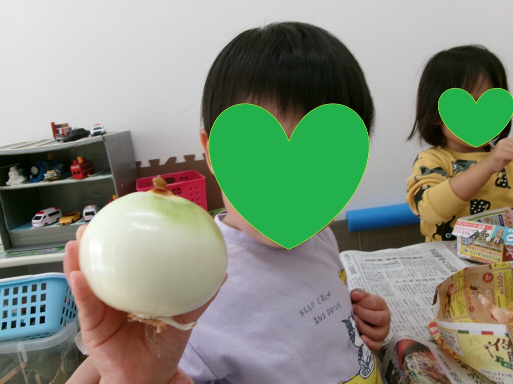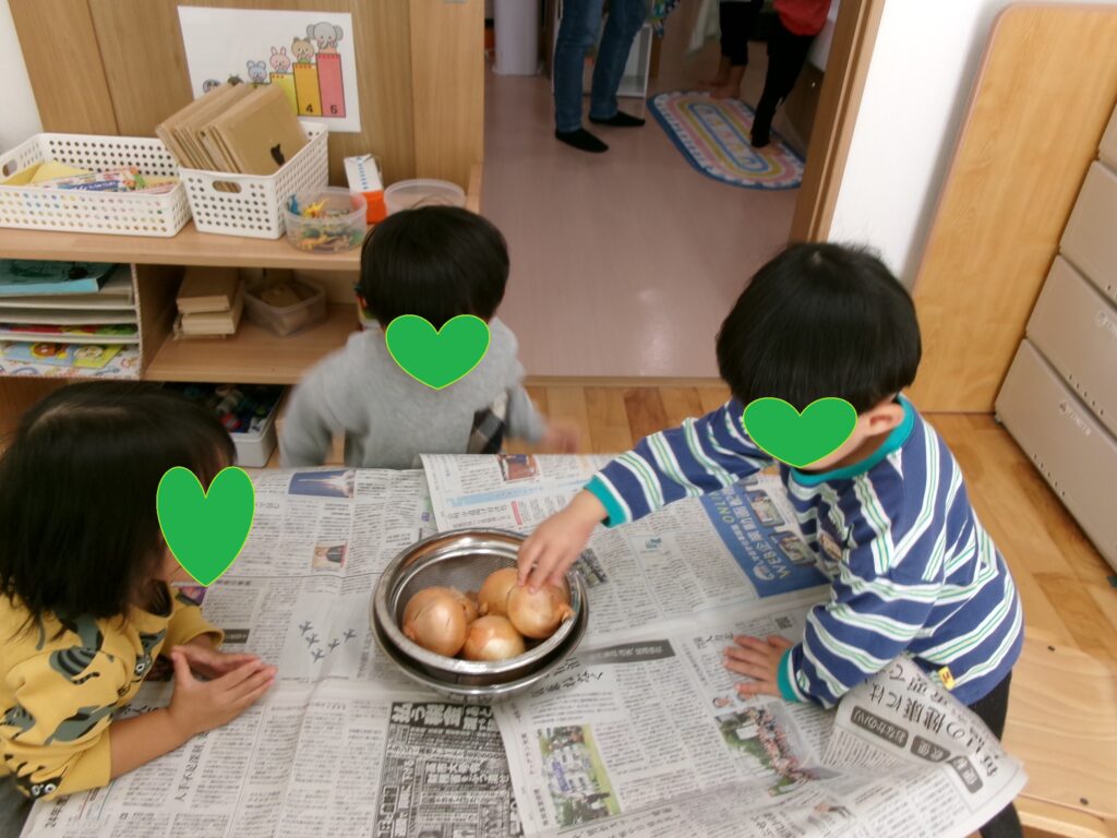 カレーパーティーの準備で子ども達がお手伝い。 1歳児は大きなさつまいもをタライに入れるとごしごしごしと、小さな手でおいもを擦ってきれいに洗ってくれました。2歳児さんは、今日のお当番さんが代表で給食室に玉ねぎをもらいに行き、ひとり1個玉ねぎの皮をむいてくれました。皮をむく前の先生の話も真剣に聞いて、やる気満々でした。出来上がったカレーは、自分達でお手伝いしたこともあって、とても美味しくてみんな完食でした。