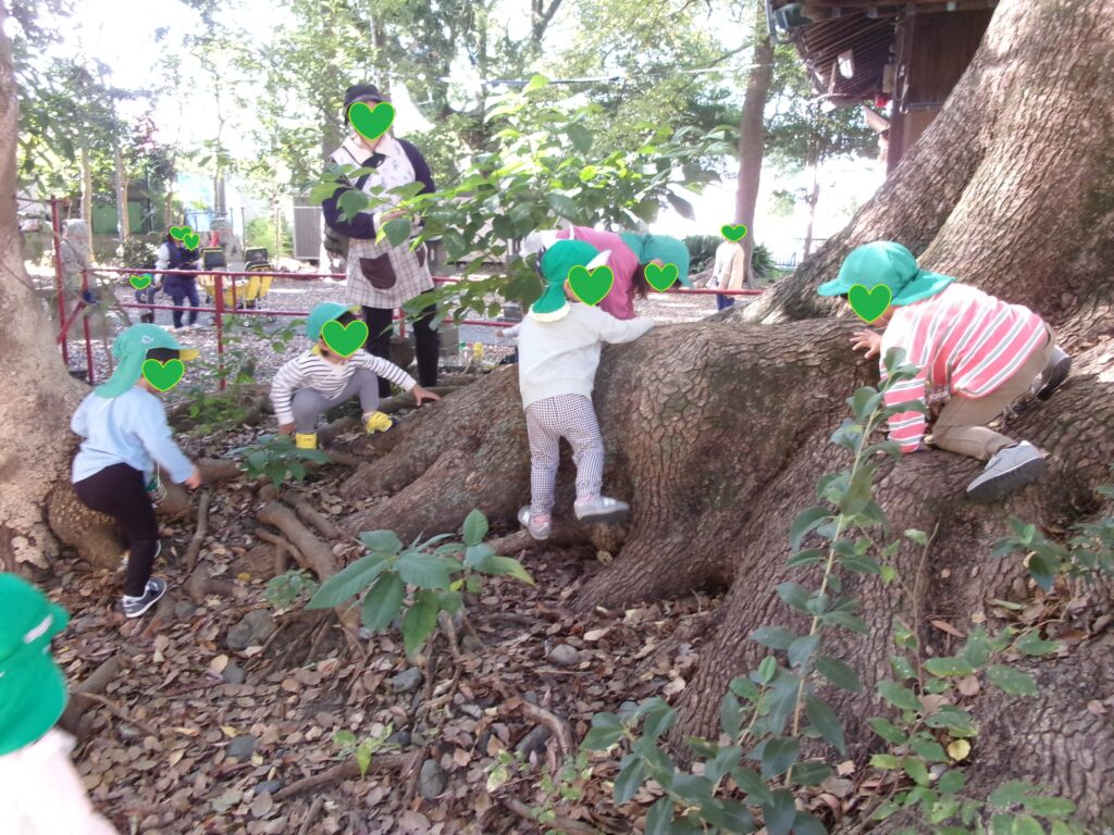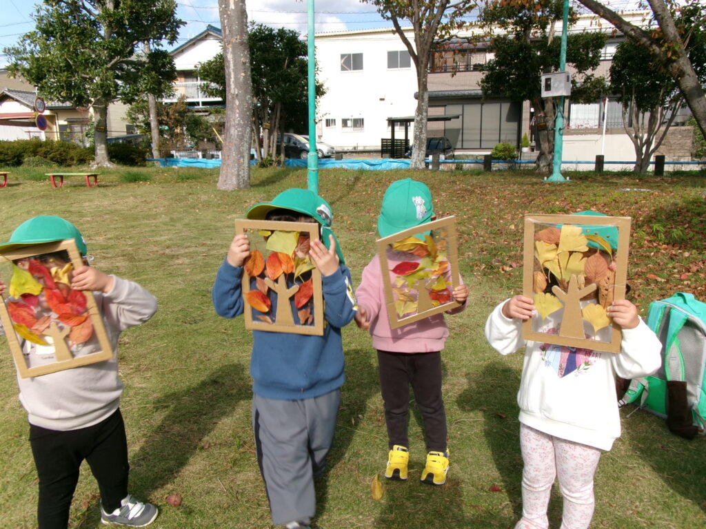 様々な色の落ち葉が舞い落ち、秋も深まる頃となりました。子ども達はまつぼっくりやどんぐり拾い、生きもの探しに夢中でお散歩を毎日楽しんでいます。朝晩の寒さも感じるようになりだんだんと冬の訪れを感じますが、元気いっぱい体を動かし秋の自然にたっぷりと触れ合っていきたいと思います。