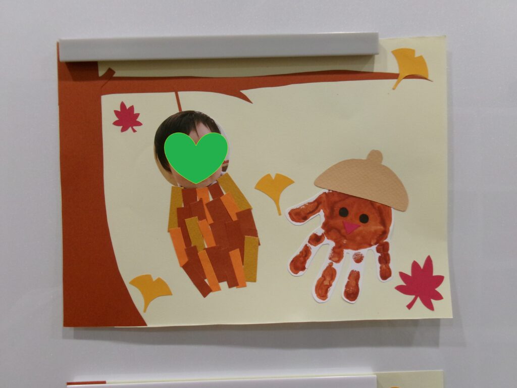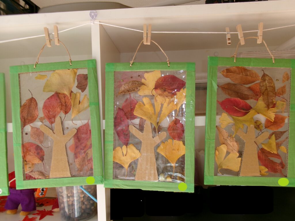 2歳児が、公園で紅葉した落ち葉を拾って製作遊びをしました。 段ボールの枠組みの真ん中に透明テープを貼って、そこに段ボールでできた葉っぱのない木に、子ども達がそれぞれ拾い集めた落ち葉を貼り付けて、キレイな木を作りました。お部屋での製作とはまた違ってとても楽しそうに取り組んでいました。