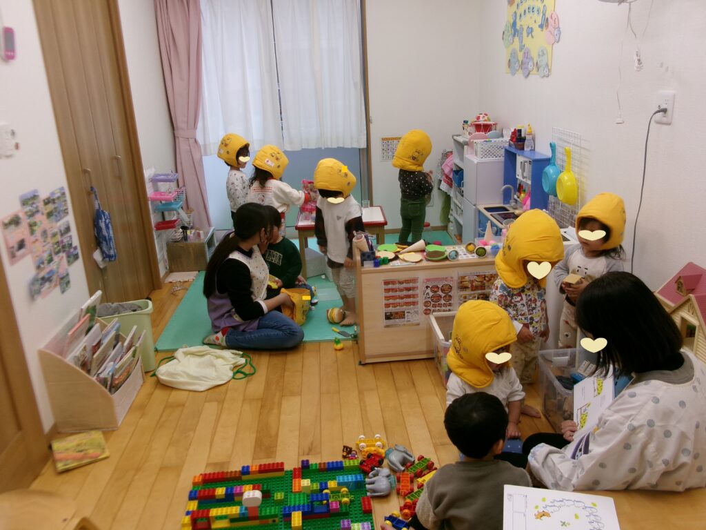 訓練が終わった後にもう一度、お部屋でカメさんポーズと防災頭巾を被る練習をしました。